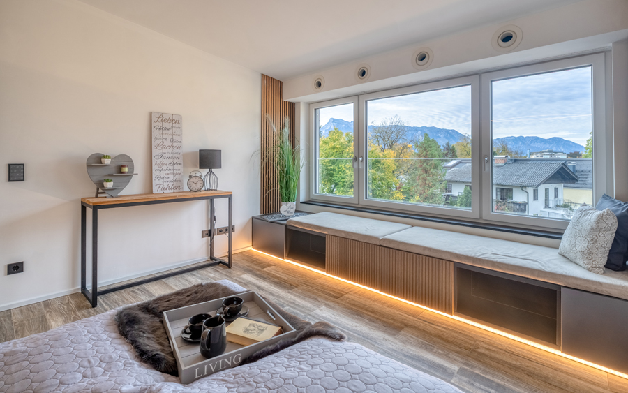 Relaxation awaits in the sunny terrace garden or on the rooftop terrace, which offers ultimate privacy and stunning mountain views. In this attractive Maxglan location, you’ll enjoy a peaceful yet central setting with excellent infrastructure: shops and bus connections are within walking distance, and the Old Town is just a short cycle ride away. A separate entrance leads into this private retreat with a light-filled living area that opens to the gable, featuring a modern exposed fireplace and a sculptural staircase. Perfect for a stylish lounge area adjoining the generous dining space and a quality kitchen with a breakfast bar. The two bedrooms are served by a contemporary bathroom with a walk-in rain shower.