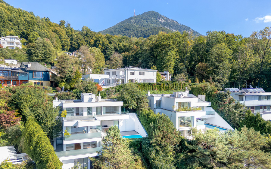 Set in a wonderfully peaceful location at the foot of the Gaisberg, this modern designer villa boasts a range of impressive features and stunning views of Salzburg, the iconic fortress, and the breathtaking mountains.