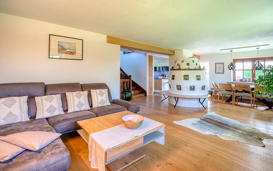 Welcome to this spacious, designer country house on the idyllic edge of Hallein, where the surrounding mountains form a stunning natural backdrop to a lovingly maintained plot with mature trees. The open-plan layout is just as appealing as the panoramic conservatory windows and the rustic tiled stove, which adds a cosy ambience on winter evenings.