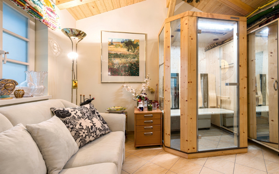 Das „Gartenhäuschen“ ist mit einer gemütlichen Couchecke eingerichtet und beherbergt außerdem eine Infrarotsauna. EA i. A.