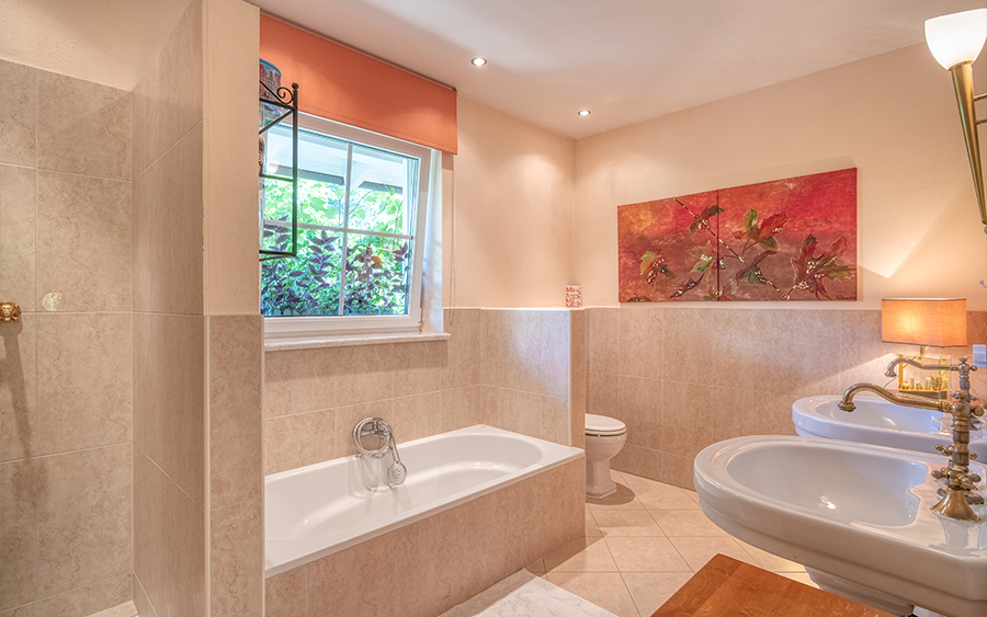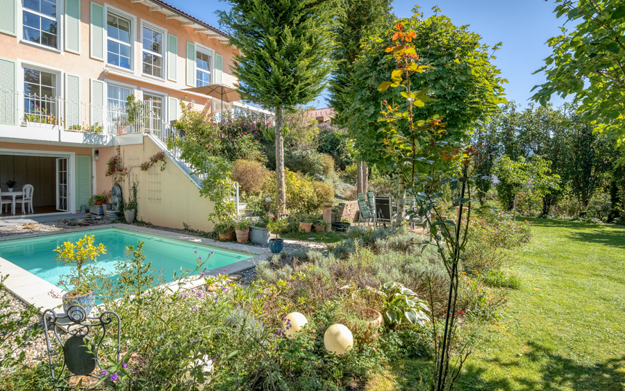 Im weitläufigen Wohnsalon zaubern Specksteinofen und italienischer Cottoboden ein Ambiente voll Harmonie und Wärme: Loungezone mit Wintergarten, Essbereich und die Minacciolo-Holzküche mit Zugang in den Kräutergarten gehen offen ineinander über, auf der Travertin Terrasse empfängt Sie die sensationelle Aussicht in die Berge. Der Elternbereich auf dieser Ebene besteht aus Schlafzimmer mit Ankleide und Bad en suite. Im Obergeschoß vier vielseitige Zimmer und zwei voll ausgestattete Bäder. Im Untergeschoß gelangen Sie über einen schicken taghellen Raum direkt zum Pool und ins Gartenparadies. HWB 96