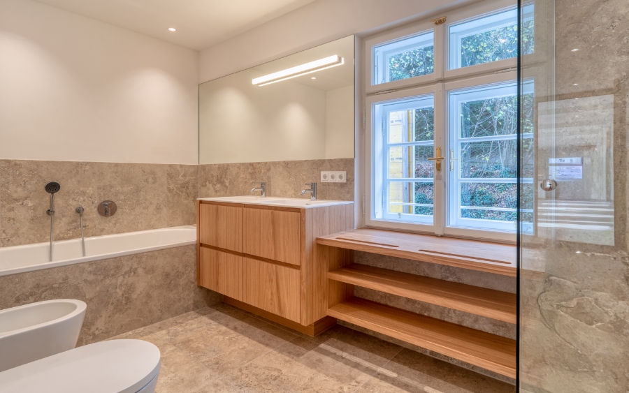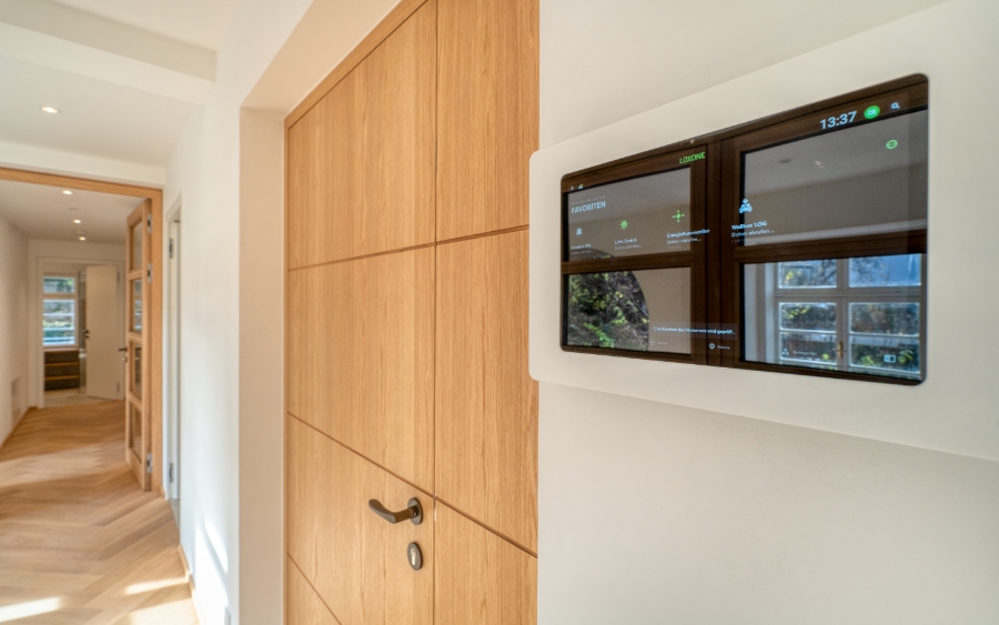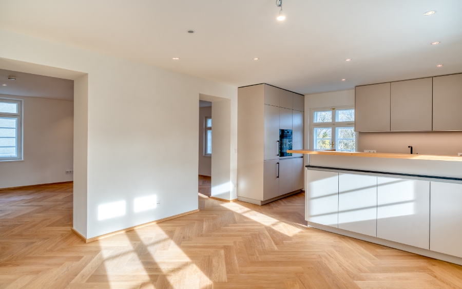 Die maßgefertigte Küche von Prehal-Manufaktur mit hochwertigen Miele-Geräten sowie der angrenzende Wohnbereich mit dem edlen Fischgrätparkett in Eiche, ein Schlafzimmer mit Zugang auf den Balkon sowie zwei weitere, individuell nutzbare Schlafzimmer unterstreichen das großzügige Platzangebot. Zwei elegante Badezimmer jeweils mit Tageslicht, WC und Armaturen von Dornbracht und einer Ausstattung von Geberit und Laufen sorgen für rundum Wohlbefinden, ebenso wie die Smart-Home-Lösung von Loxone. Ein Kellerabteil bietet Stauraum, für Ihre Pkw stehen zwei Carport-Stellplätze sowie eine Wallbox zur Verfügung. EA.i.A.
