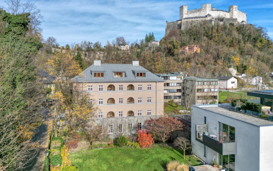 In einer der schönsten und begehrtesten Lagen Salzburgs, der Festung Hohensalzburg unmittelbar zu Füßen genießen Sie in dieser exklusiven Luxuswohnung eines komplett revitalisierten Hauses aus den späten 1920-er Jahren höchste Wohnqualität und eine einmalige Aussicht vom Arkadenbalkon. Das historisch getreu sanierte Wohnhaus mit einem Madonnenfresko von Theodor Kern befindet sich nur einen kurzen Spaziergang von der Innenstadt entfernt. Das Grün des Krauthügels liegt direkt vor der Haustüre und Schloss und Weiher Leopoldskron sind in kürzester Zeit zu Fuß zu erreichen.