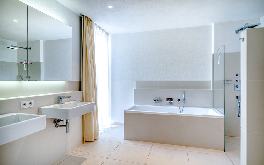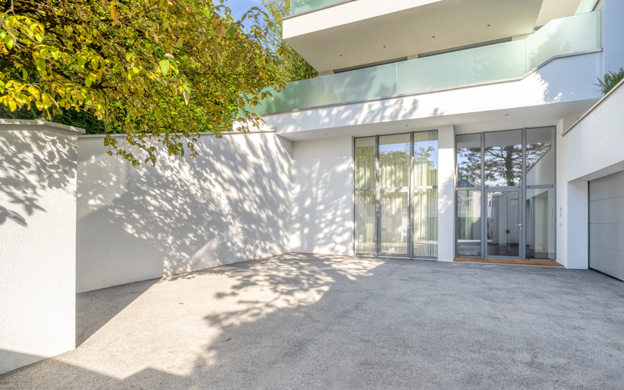 Der Masterbereich im Dachgeschoß mit herrlicher Panoramaterrasse ist Ihr Rückzugsort und Logenplatz – dank großflächiger Verglasungen genießen Sie die grandiose Aussicht auch vom Schlafzimmer mit Ankleide en suite und selbst im edlem Bad mit Wanne und Walk-in Regendusche. HWB 56.