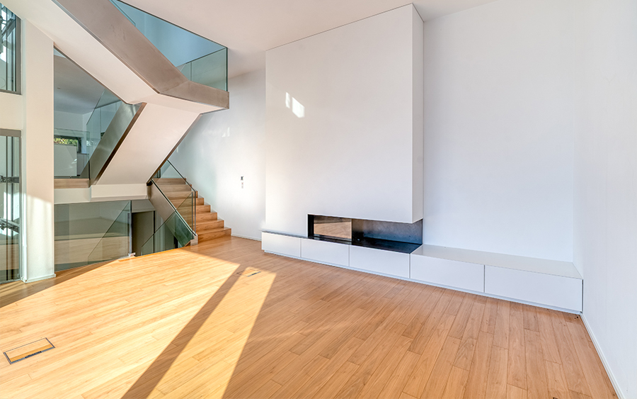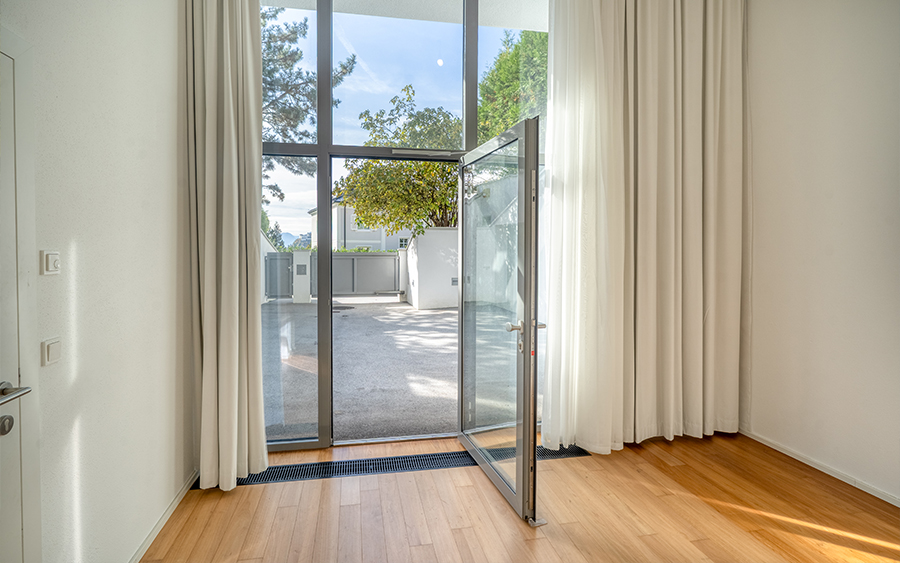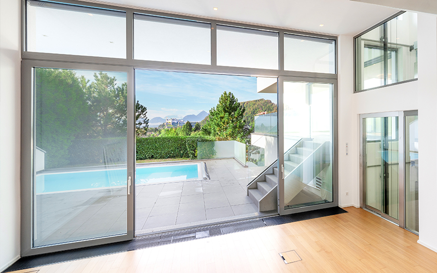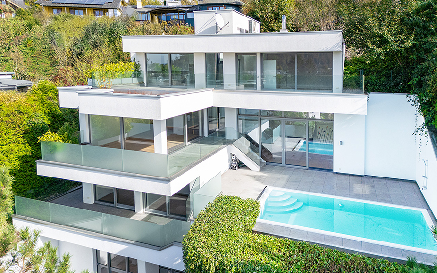 Der Panoramaglaslift bringt Sie vom Entrée bequem in alle Stockwerke, mindestens genauso ein Blickfang sind aber auch die eleganten Treppen mit gläsernen Geländern – zusammen mit den XL-Glaselementen, die die traumhafte Aussicht in allen Räumen gekonnt in Szene setzen verleihen sie der lichtdurchfluteten Villa eine offene, luftige Wohlfühlatmosphäre. Im ersten Obergeschoß befindet sich ein eigener Bereich für Kinder oder Gäste, mit zwei Schlafzimmern und einem modernen Bad, eine Ebene darüber der weitläufige Wohn-/Essbereich mit Zugang auf die Pool-Terrasse.