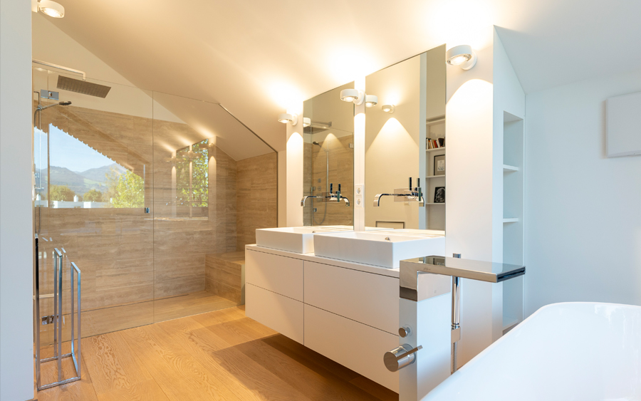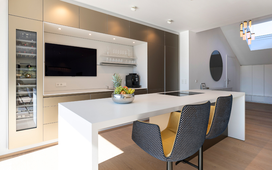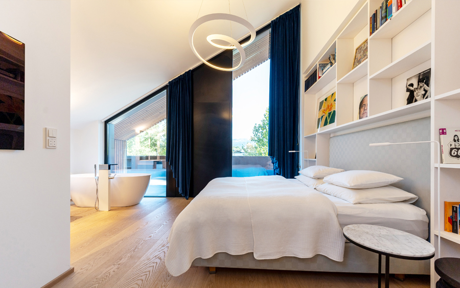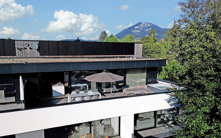 Im DG mit bis zu 4,5 m Raumhöhe leitet Sie das repräsentatives Entrée in die großzügige Living Area mit bodentiefer Panoramaverglasung, wo die voll ausgestattete Bulthaup-Designküche nahtlos in den kommunikativen Ess- u. Loungebereich übergeht. Auf der Dachterrasse erwartet Sie eine grandiose Aussicht vom Untersberg bis ins Tennengebirge. Der Masterbedroom mit luxuriös öffenem Bad samt freistehender Wanne folgt auf die stilvolle Ankleide mit maßgefertigtem Interieur. Eine grazile Treppe führt Sie auf die Ebene darunter zu einem weiteren Schlafzimmer mit Bad ensuite sowie einem großen Wohnraum mit zauberhafter Sonnenterrasse, der aktuell für Hobbies/Fitness verwendet wird. HWB 21.