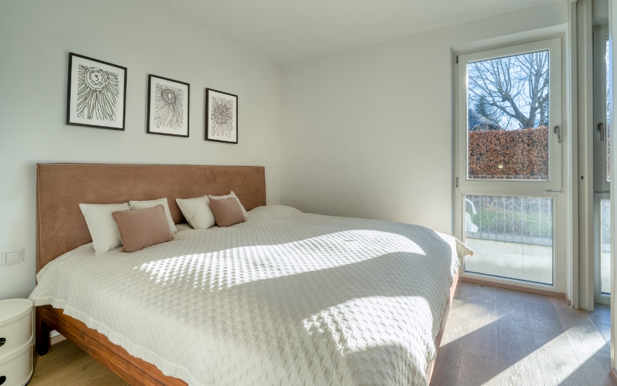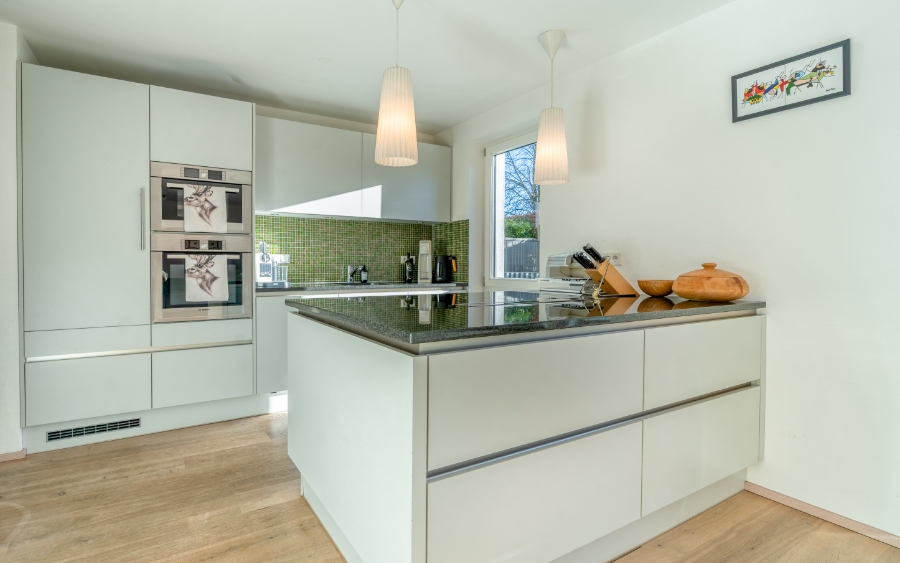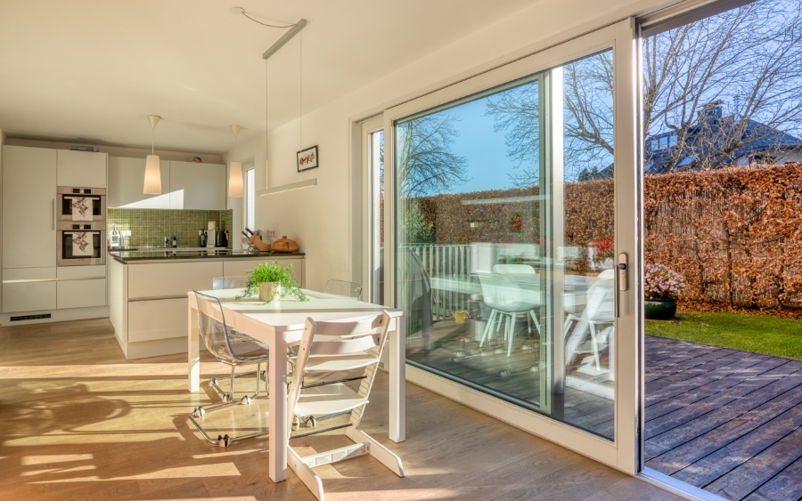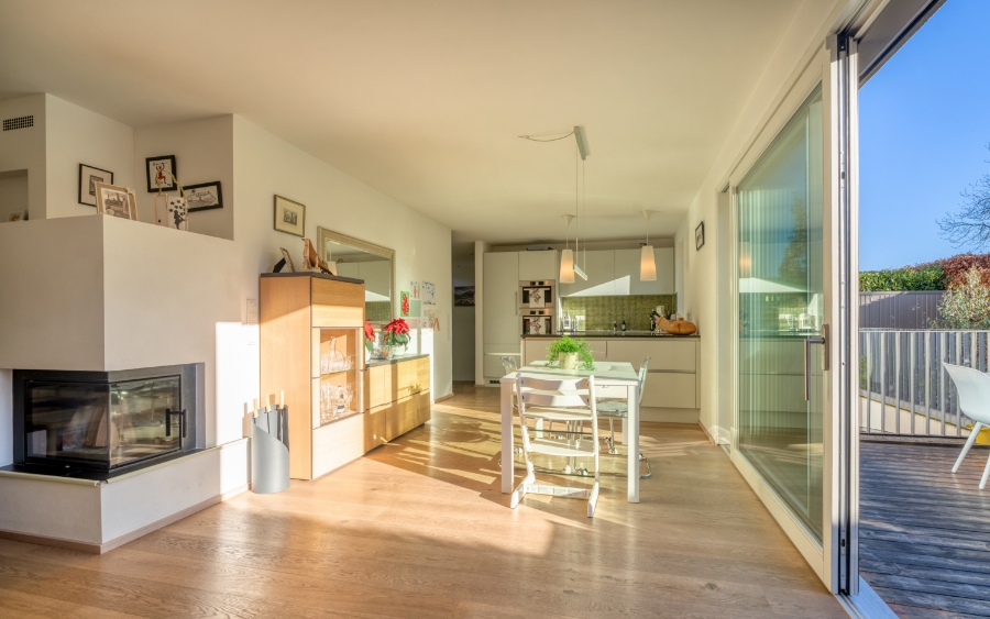 Im Mittelpunkt die herrlich helle Living Area mit großer Panoramafront in den hübschen Garten, wo sich jeder sein Plätzchen gestalten kann. Der hochwertige Biofire-Speicherofen mit Sichtkamin neben der Sofa-Zone sorgt abends fürs gemütliche Zuhause-Gefühl. Auf den Essplatz folgt die kommunikative Küche mit hochwertiger Granitplatte. Neben dem Schlafzimmer mit Ankleide das schicke Bad mit Walk-In-Dusche.