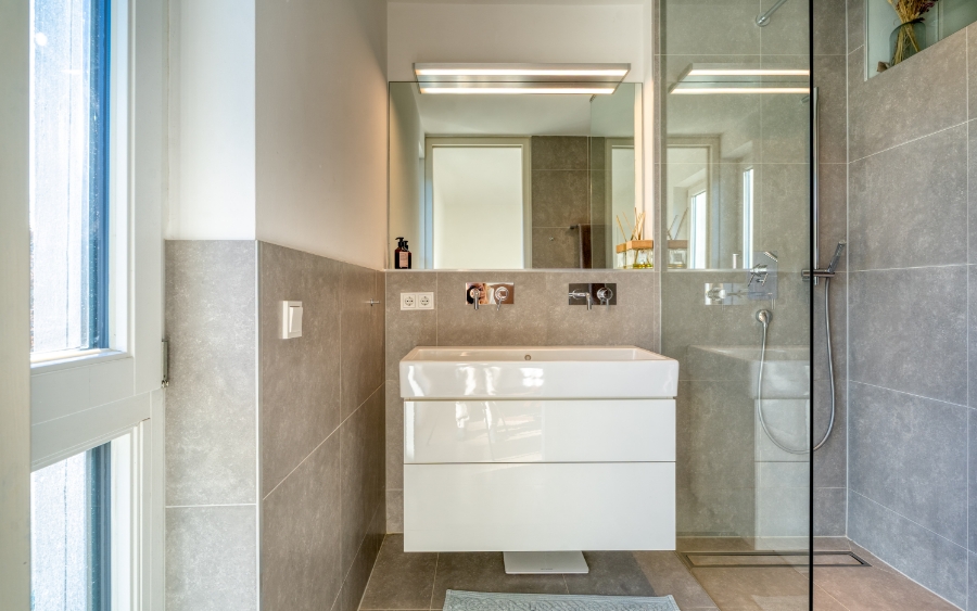 Im UG eine praktische Garderobe und viel Stauraum im Abstellraum sowie den maßgefertigten Apothekerschränken unter der Stiege. Drei taghelle Räume, die ganz nach Bedarf für Fitness, Hobbies oder als Homeoffice etc. einsetzbar sind, führen auf eine Atrium-Terrasse, die sich mit Kübelpflanzen zu einer entzückenden Oase gestalten lässt. Auf dieser Ebene steht ein Wannenbad zur Verfügung. Ihr PKW parkt komfortabel in der Einzelgarage. HWB 36