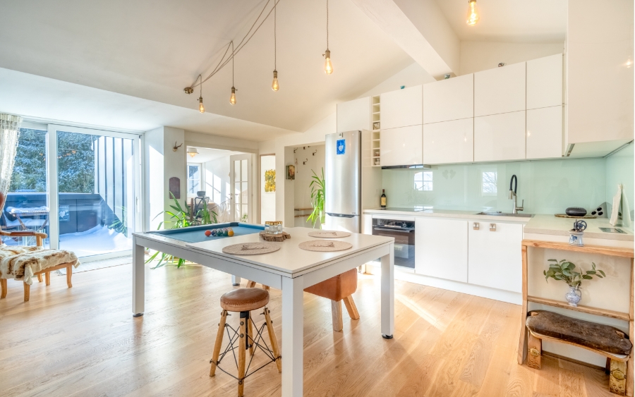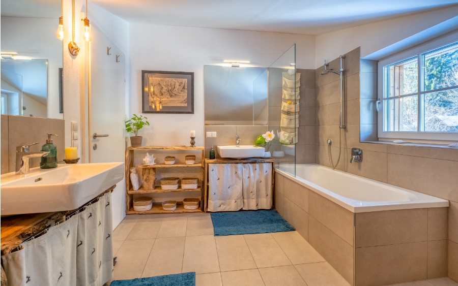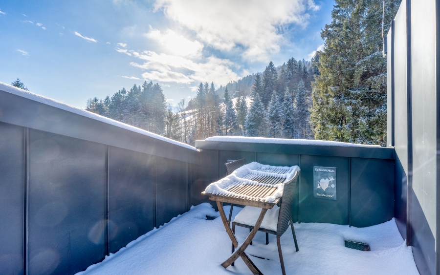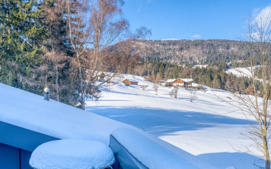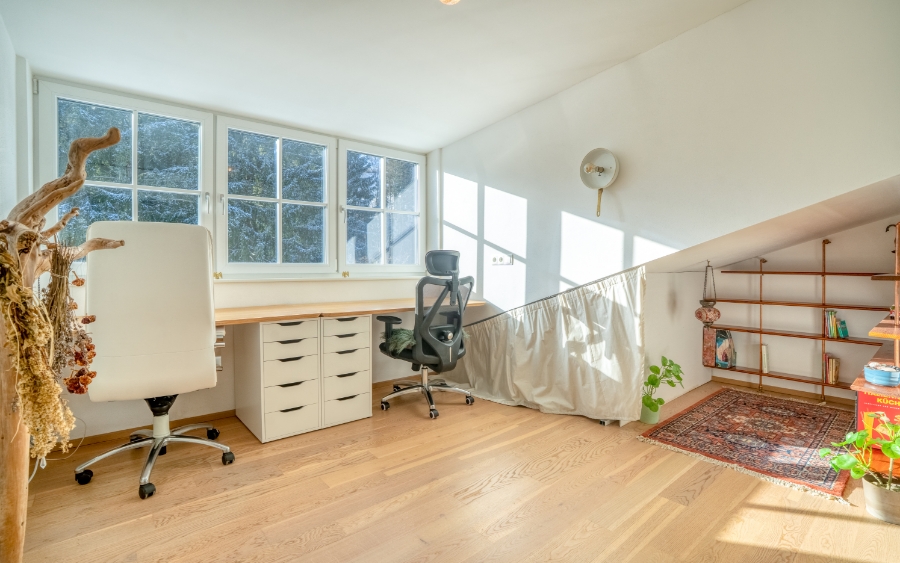 Im Zentrum erwartet Sie der gemütliche Wohnraum mit bis in den Giebel offenem Raumkonzept, der sich in die Loungezone, den mittigen Essbereich und die hübsche Tischlerküche gliedert. Je nach Sonnenstand und Aussichtslust wählen Sie die Ost- oder die West-Terrasse um den Tag mit Café zu beginnen oder mit einem Gläschen Wein ausklingen zu lassen. Das malerische Panorama verstärkt die wohltuende Wirkung der Außensauna. Beide Schlafzimmer sind prädestiniert fürs Kraft tanken in himmlischer Ruhe – eines davon wird aktuell als lichterfülltes Homeoffice verwendet. Das moderne Bad ist schlicht und zeitlos gestaltet. Zum Verstauen der Haushaltsgeräte sind die Stauflächen in den Wandnischen besonders praktisch, für die PKW stehen ein Carport- und ein Stellplatz bereit.