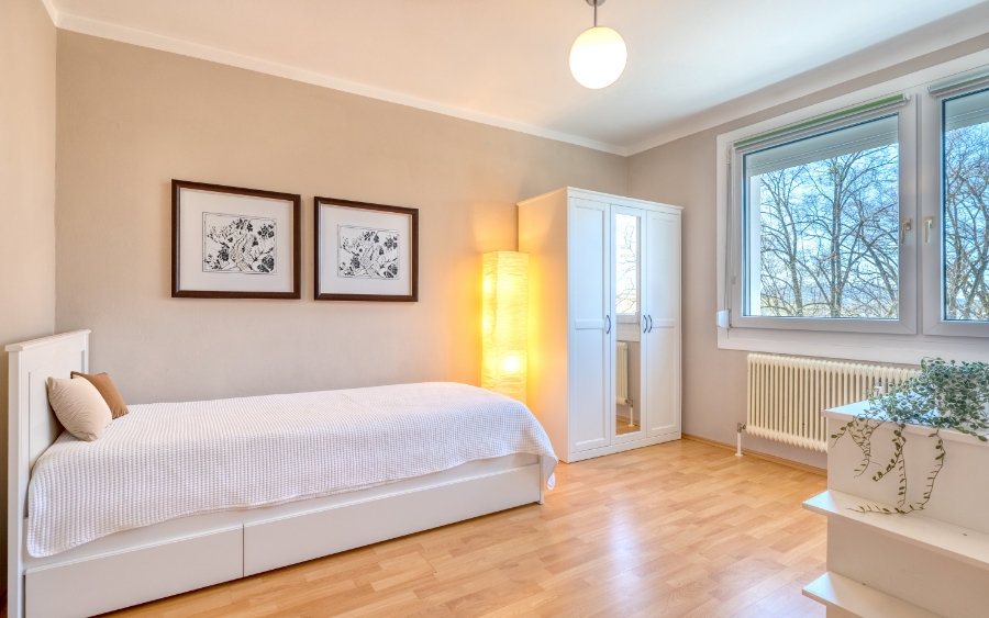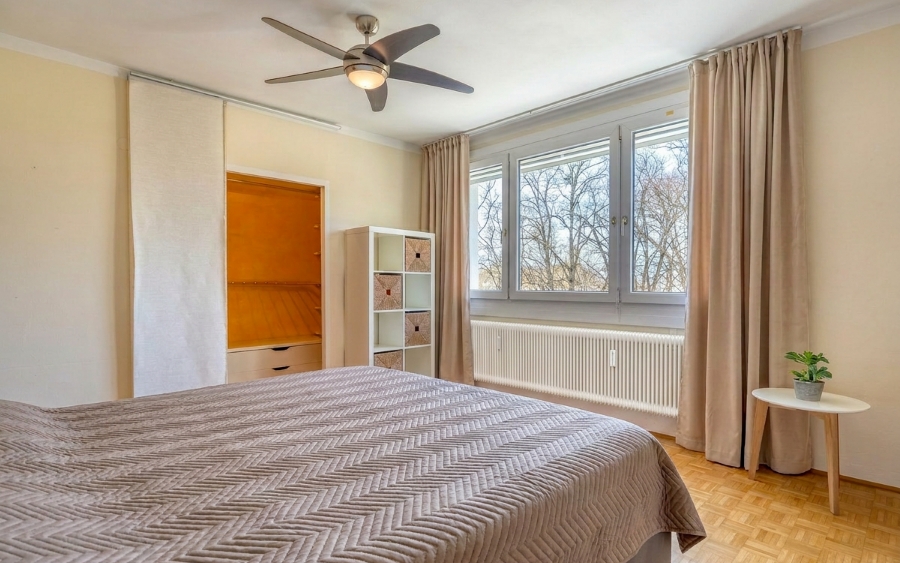 Eines der beiden großen Schlafzimmer ist derzeit in zwei Räume geteilt, das zweite individuell nutzbare Zimmer verfügt über einen zusätzlichen Schrankraum. Im Badezimmer verwöhnen eine Wanne und eine Dusche, ein separates WC, ein Kellerabteil und ein Abstellraum ergänzen das Raumangebot. Für Ihren Pkw stehen allgemeine Parkplätze zur Verfügung. HWB 42 fGEE 1,05