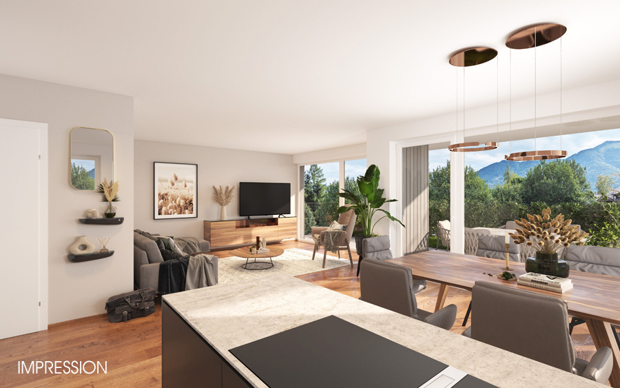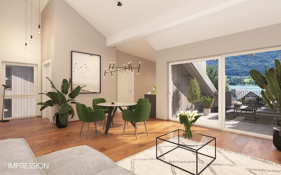 Durchdachte Planung und hochwertige Ausstattung garantieren Wohnkomfort mit viel Privatsphäre auf der Sonnenseite des Fuschlsees: Jede der Wohnungen erstreckt sich über eine gesamte Etage, eine verfügt darüber hinaus über einen großen Raum mit Atriumterrasse, der sich z.B. perfekt als Wellnessoase oder Büro eignet. Die Living Areas sind kommunikativ konzipiert, große Glaselemente fluten die Zimmer mit Licht und fangen das herrliche Panorama ein. Aus den großzügigen Terrassen- und Balkonflächen werden in der warmen Jahreszeit herrliche Outdoor-Wohnbereiche, wo Sie die Sonne von früh bis spät genießen können. Im EG bezaubert jeweils die eigene große Gartenoase und auch die Wohnungen im OG verfügen über kleine Privatgärten. Auf den Dachterrassen verwöhnt Sie die glitzernde Augenschmeichler-Aussicht zum See. Komfortabel und individuell gestaltbar ermöglichen die Schlafzimmer genügend Rückzugsraum, die modernen Bäder sind qualitativ hochwertig ausgestattet. HWB 37-39, fGEE 0,57